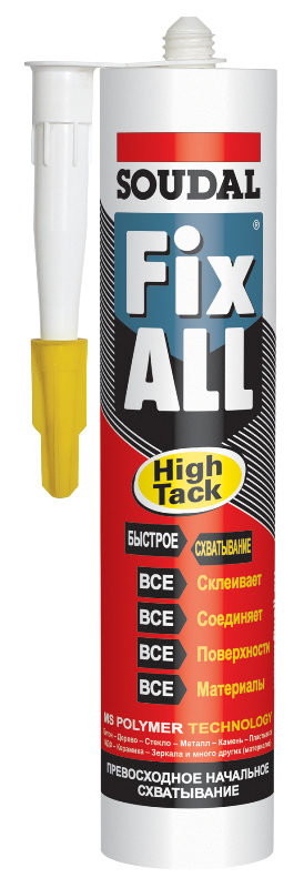Клей Soudal Fix All Hight Tack Гибридный клей-герметик предназначен для монтажа элементов архитектурного декора из пенополиуретана карнизов, молдингов, колонн, плинтусов на потолки и стены любого типа.