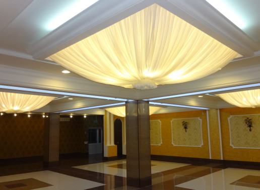 В проекте использованы карнизы скрытого освещения, полуколонны, молдинги с угловыми элементами и классические карнизы.